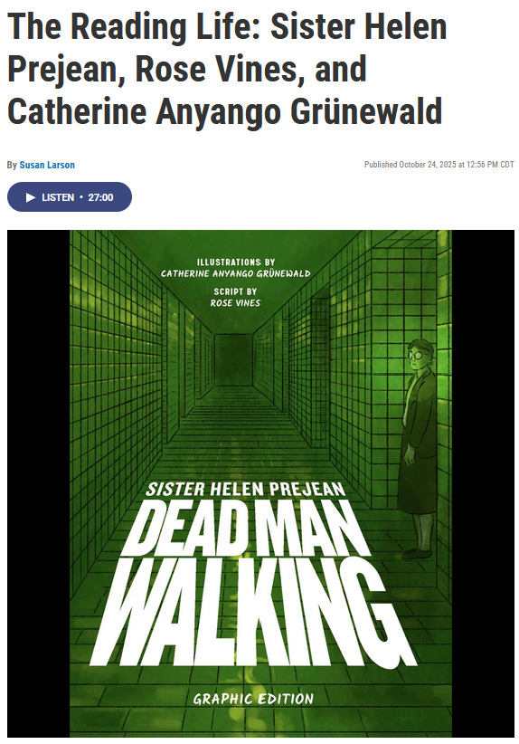 On October 28, Penguin Random House published the graphic adaptation of Dead Man Walking by Helen Prejean, Rose Vines, and Catherine Anyango Grünewald. It’s an amazing visual retelling for the next generation with a whole bunch of new insights from the present day.
