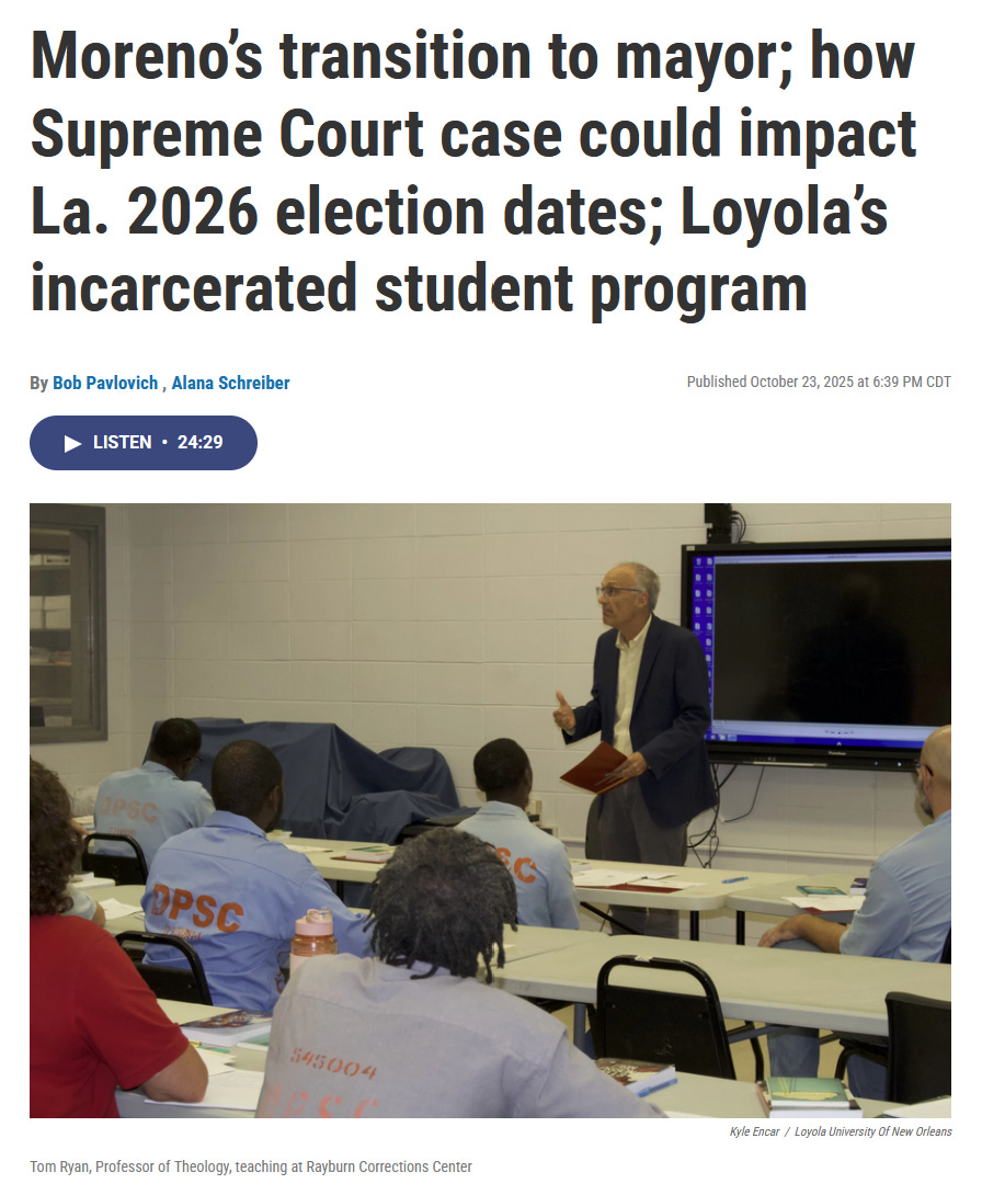 My friends at the Jesuit Social Research Institute (JSRI) were recently featured on Louisiana Considered for their work to secure Pell Grants for incarcerated students. Now, students at Rayburn Correctional Center can gain a four-year degree through Loyola’s Prison Education Program. It makes me so happy to know people on the inside can attend college classes again with Loyola’s support.